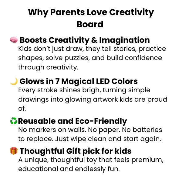 Spark Creativity with less screen time. This creativity tool, helps turn creativity into light while keeping the use engaged for hours and helping them learn, create and express their imagination/message in a fun, healthy way.
